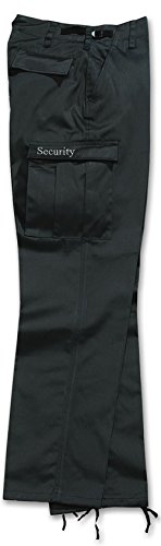 A well made durable pair of BDU combat trousers featuring many pockets and with the lettering SECURITY embroidered on the leg pocket.